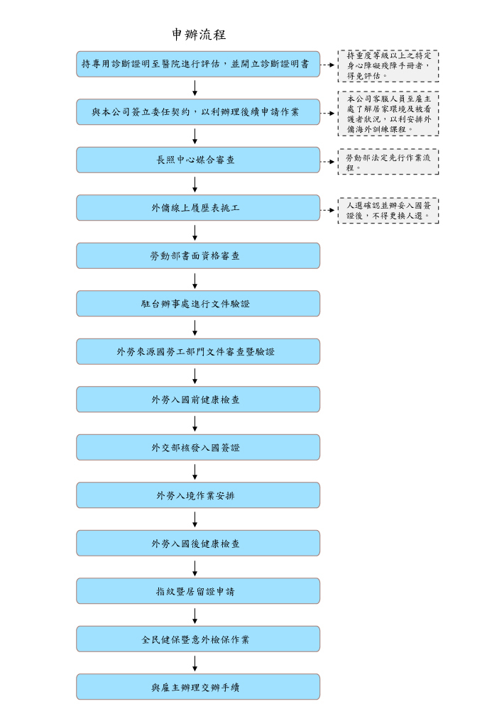 1. 據上流程,得申請外籍監護工者其經醫療團隊照護評估須為『需24小時照護』。病症暨失能診斷證